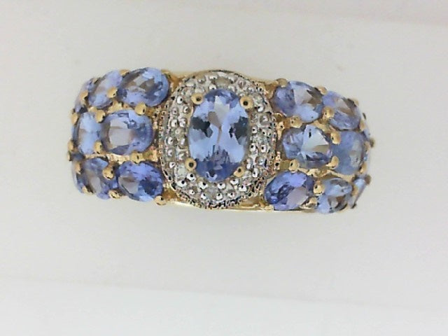 Lady's Yellow 10 Karat Contemporary Fashion Ring Size 8 With 18= Oval Tanzanites And 9= Round Diamonds
