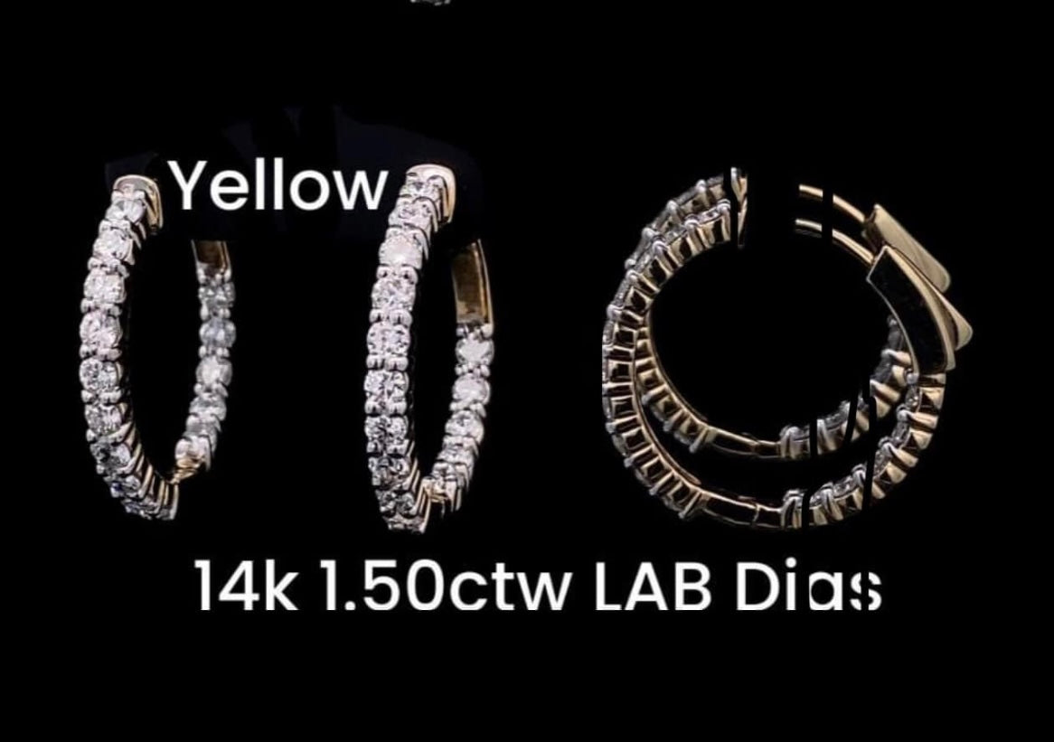 Beautiful inside out lab grown diamond hoops set in 14kt yellow gold. Round diamonds total weight 1.50ct VS1-f,g color. The button release is one of the most secure latches on the market