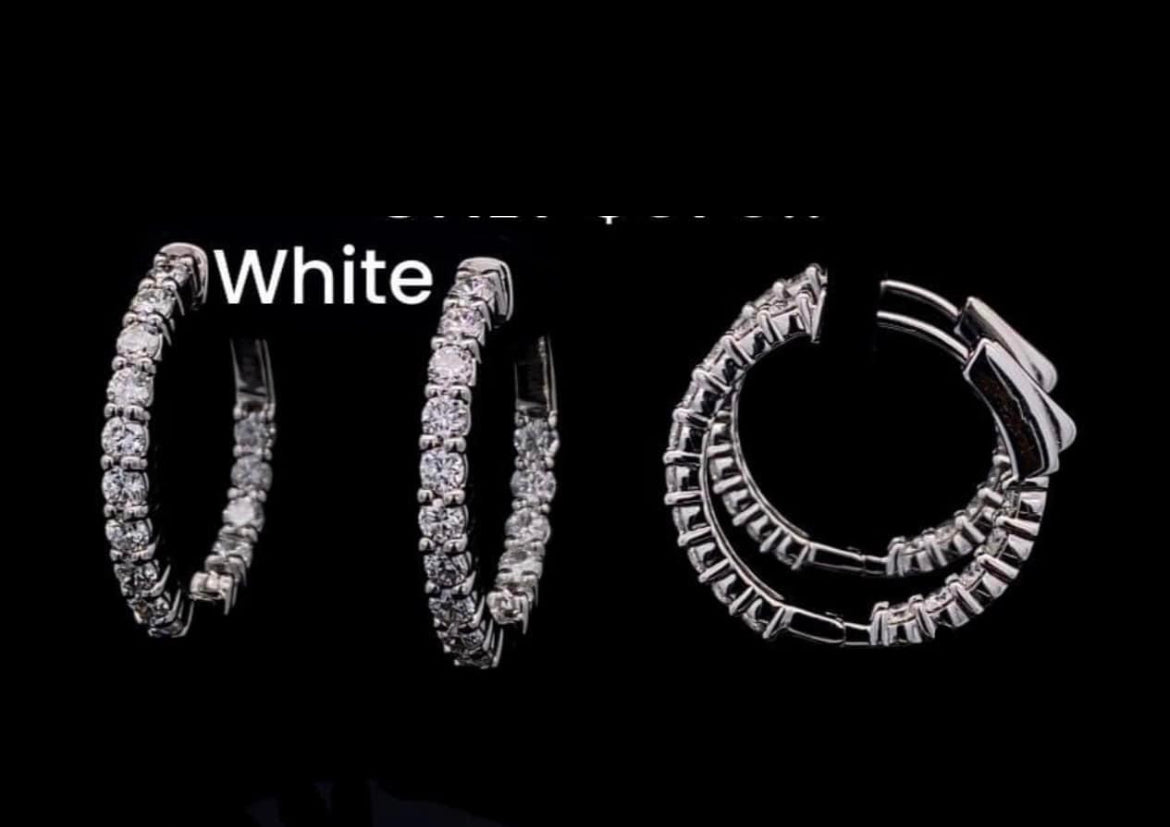 Beautiful inside out lab grown diamond hoops set in 14kt white gold. Round diamonds total weight 1.50ct VS1-f,g color. The button release is one of the most secure latches on the market